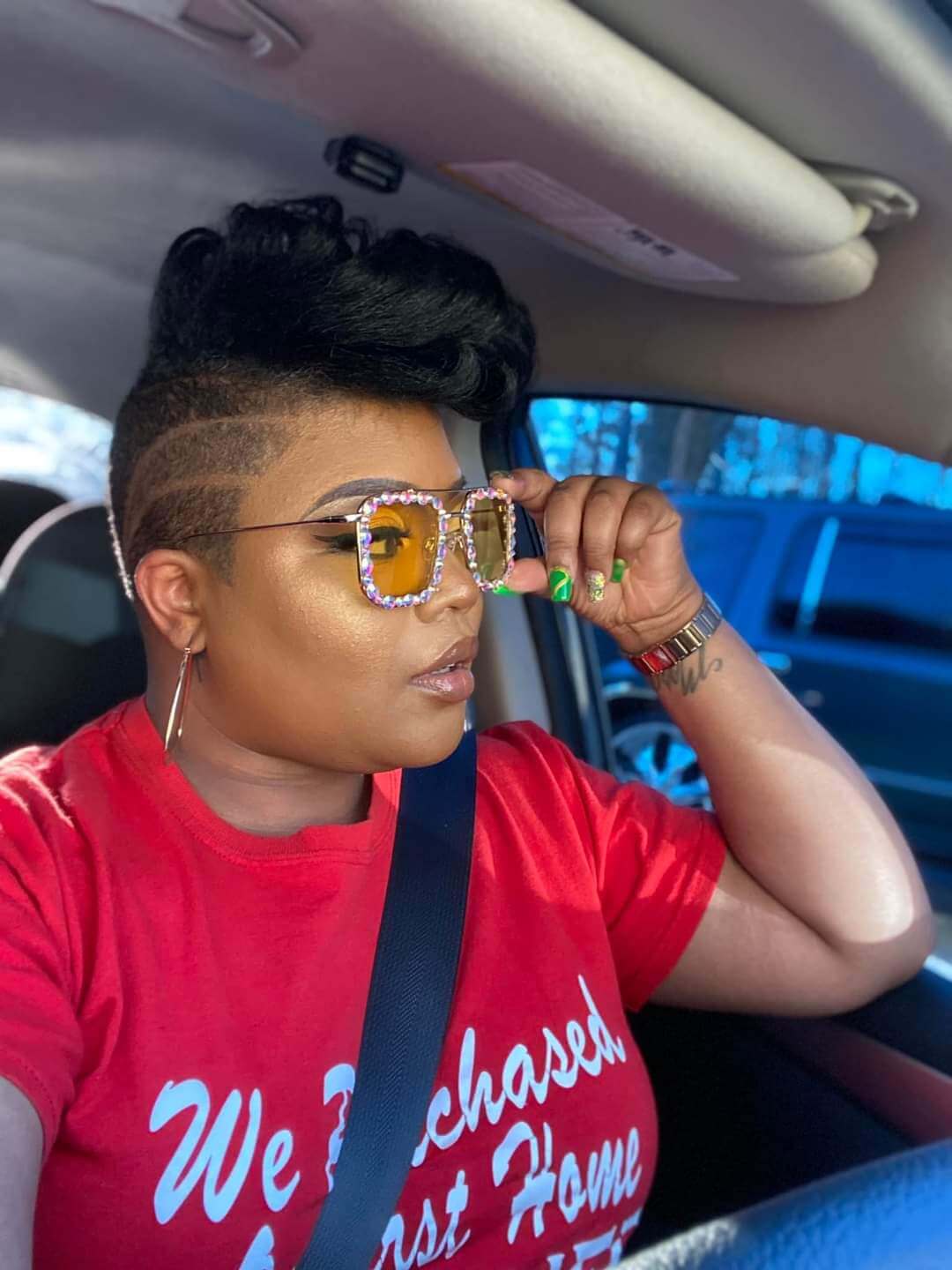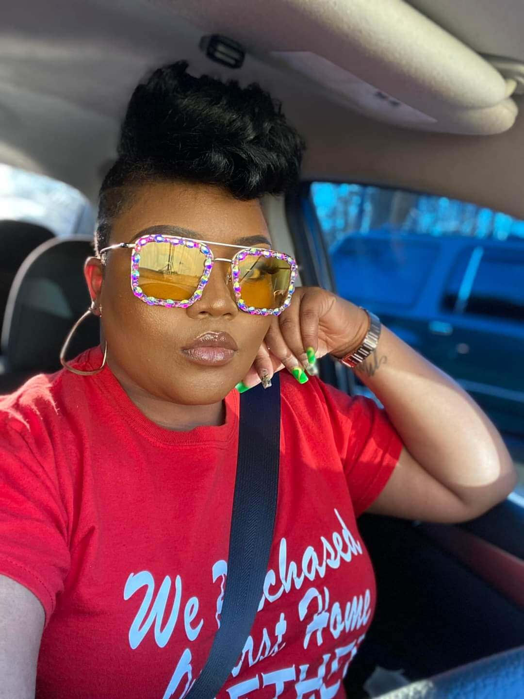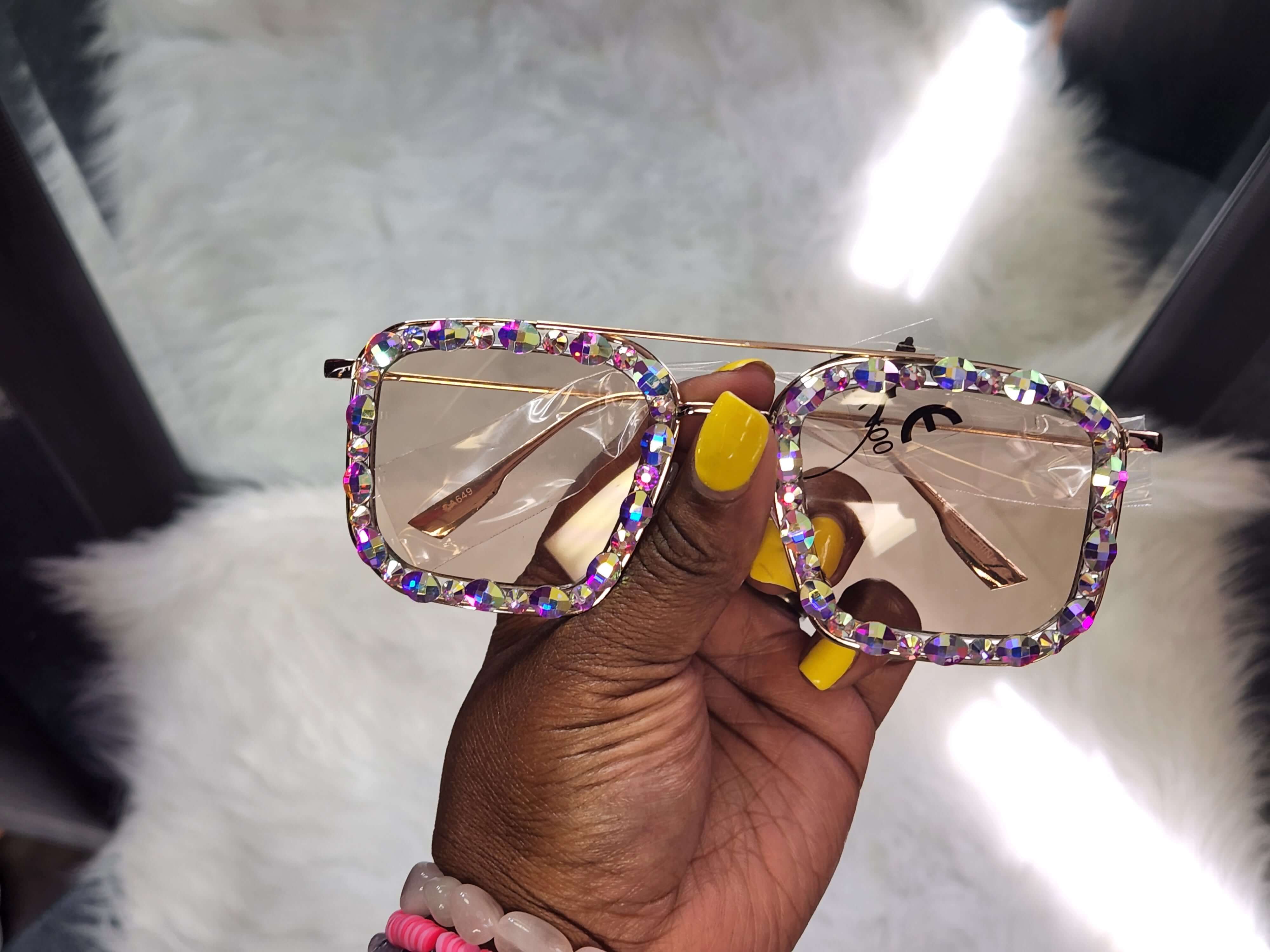 Cute oversized sunglasses with iridescent diamonds around the frame.